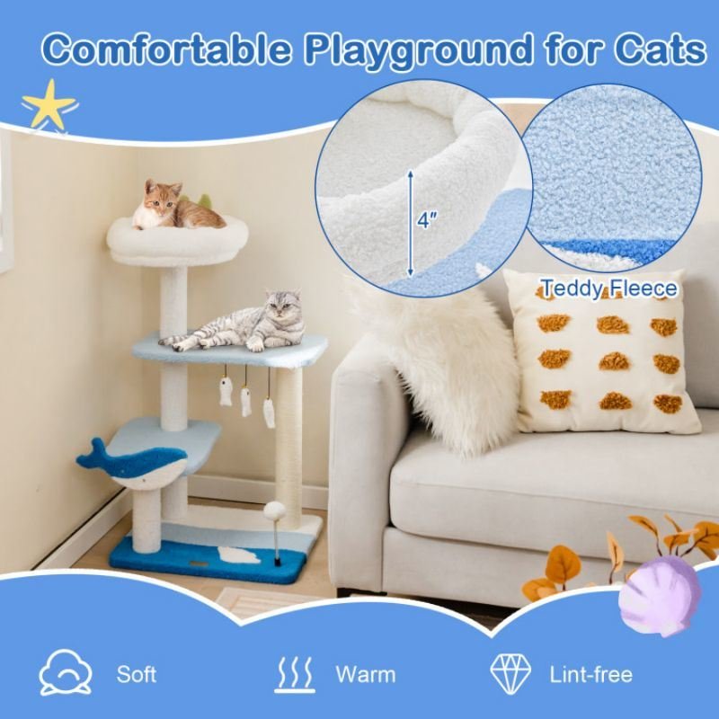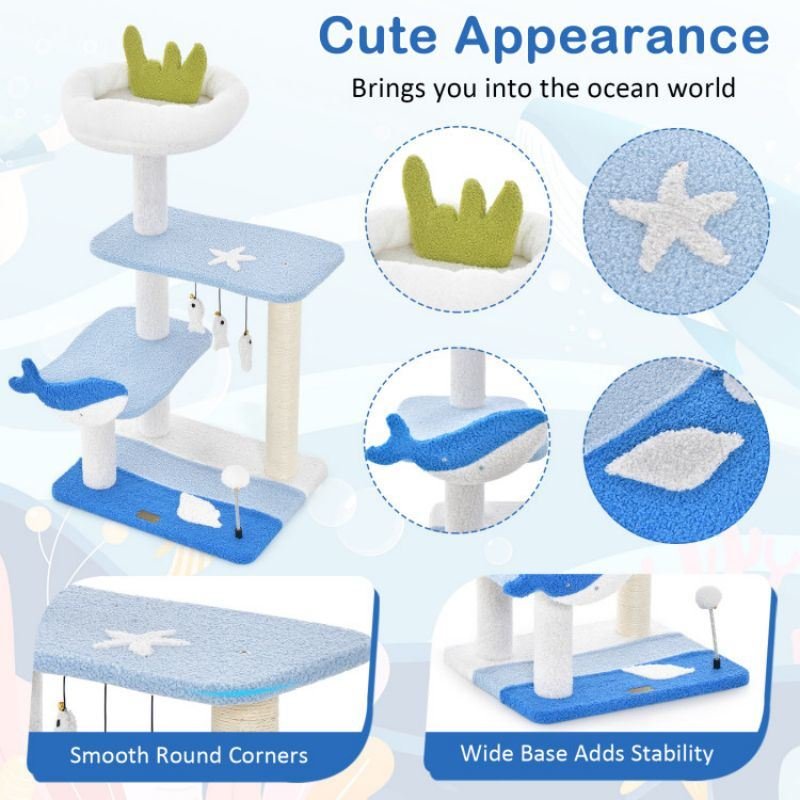 2.Unique Ocean-themed Design: The base and platforms of the cat activity center are uniquely designed to resemble waves, evoking a coastal theme. Elements such as seashell, starfish, seaweed and fish are also incorporated, further enhancing the aesthetic appeal of the cat tower.