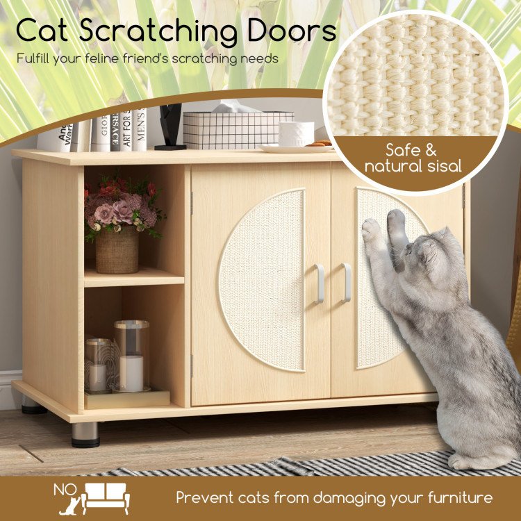 1.Funny Cat Scratching Doors: The cat litter box enclosure features double doors with scratching boards, which could fulfill your feline friend's scratching needs while protecting your furniture. Moreover, the scratching boards are crafted of safe and natural sisal.