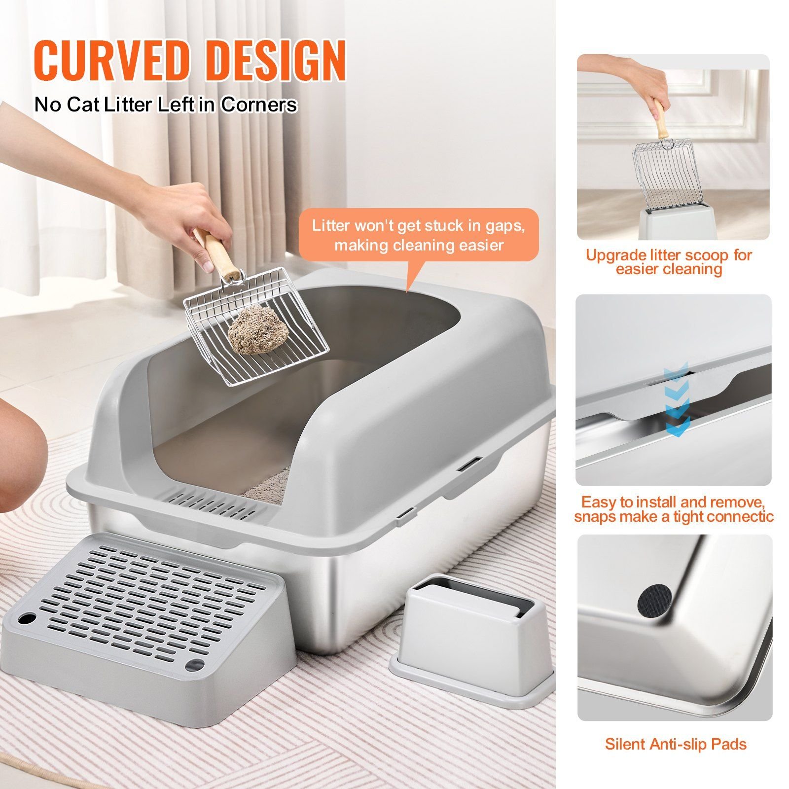 5.High-Quality Material: This cat litter box is made of stainless steel. It is non-stick and scratch-free, which can be used for a long time. Besides, it also has multiple advantages such as odor-free and non-slip. These features keep troubles away from your life.