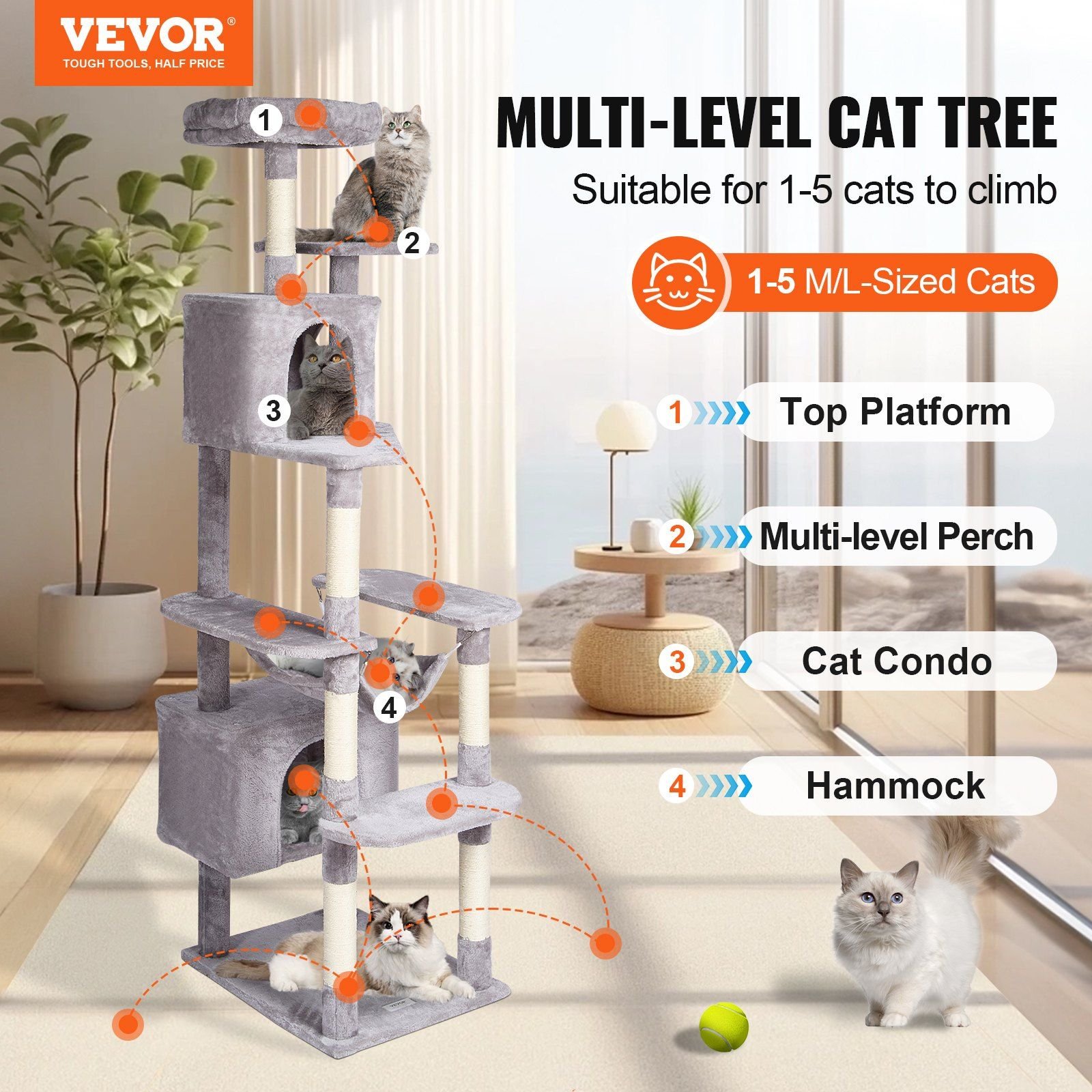 Let cats enjoy a comfortable and secure environment on this cat tower. With different resting areas including a spacious base, cozy hammock, 2 hidden cat condos, and soft top perch for cats to lounge, hide, or perch high.