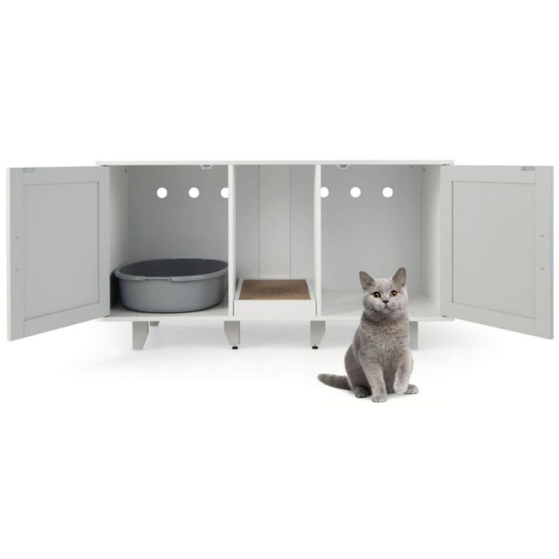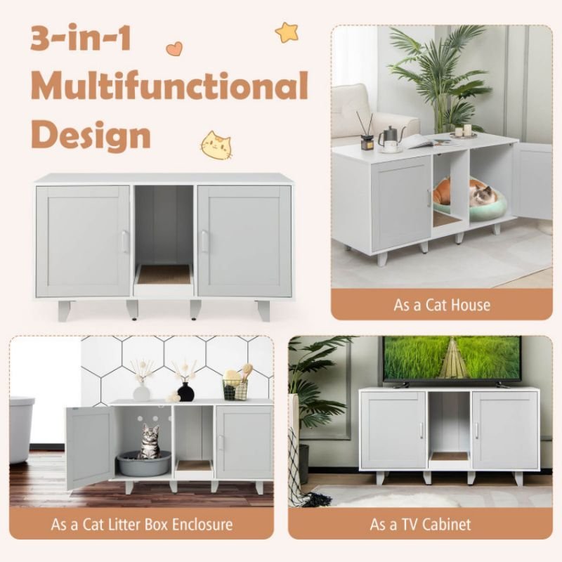 2.3-in-1 Multipurpose Design: This 2-door cabinet can be used not only as a private cat washroom to hide the mess, but also as a cozy cat house or a TV stand in the living room. The spacious tabletop fits most flat screen TVs up to 50" and can place some daily necessities such as ornaments, books, table lamps, etc.