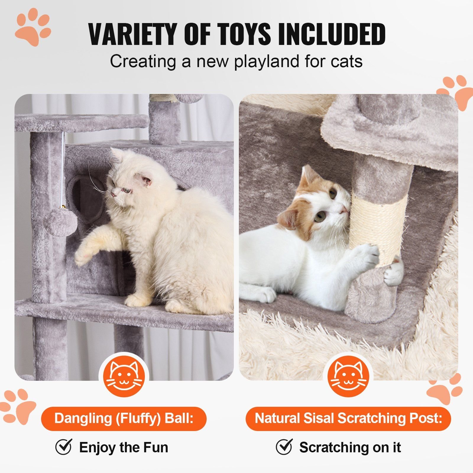 Let cats enjoy a comfortable and secure environment on this cat tower. With different resting areas including a spacious base, cozy hammock, 2 hidden cat condos, and soft top perch for cats to lounge, hide, or perch high.