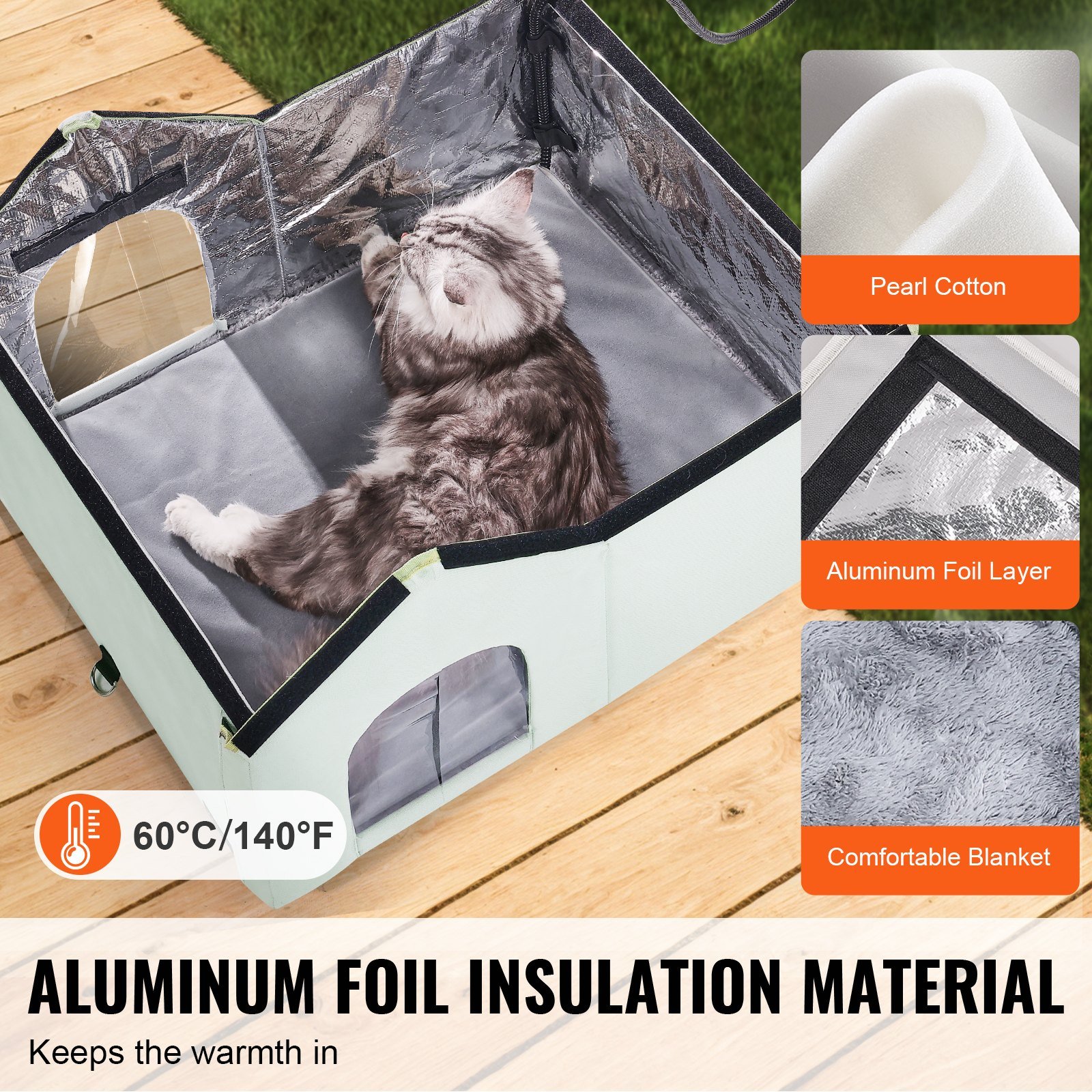 2.Powerful Insulation: The interior utilizes thermal insulation materials like aluminum foil and pearl cotton, effectively reflecting and retaining heat, preventing heat loss from the cat shelter. A blanket is included to assist in keeping your cat warm, working in tandem with the heating pad to ensure your cat's belly and other body parts stay cozy.