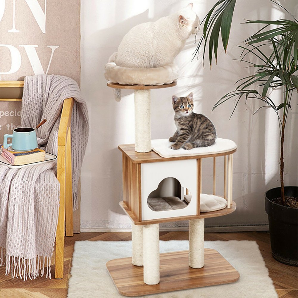 2.Exceptional Quality Materials: Comes with pet-friendly thickened soft cushions, this cat tree will deliver paws-approved warmth and ultimate comfort for your lovely kitten. Incorporated scratching posts are securely wrapped with natural sisal ropes which can not only allow your kitten to scratch repeatedly but also protect your delicate furniture from being clawed.