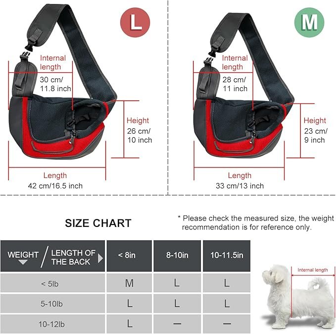 SIZE AND PETS --- WEIGHT LIMIT 12 lbs. The size of this dog carrier is suitable for small dogs, such as Cats, Chihuahua, Yorkshire Terrier, Pomeranian, Mini Poodle, Miniature Schnauzer, Teddy cups etc. Please measure your pet's weight and size before purchasing, and refer to our size chart, this may provide a good help for you to choose our pet carrier sling bag.COMFORTABLE DOG SLING CARRIER BAG --- Made from High-quality PU leather, breathable mesh fabric, comfortable sponge shoulder strap, the thickened bottom can prevent pets from scratching, and bring a more comfortable travel experience for pets. An ideal travel accessory gift idea for dog mom, dad, parents, owners and trainers.SAFE AND CONVENIENT --- A safety buckle on the inside of the pet sling carrier (it can be connected to a collar) to prevent pets from jumping out. Magic sticker prevents the zipper from slipping and effectively increases safety. The firm buckle design on the shoulder strap is convenient to use and prevents the bag from being disconnected during use.HAND-FREE DESIGN --- PUCEWMY dog carrying sling is perfect for traveling, walking, training, hiking gear, camping kit, vet visit, shopping, daily use and casual outdoor activities. The strap is adjustable, sturdy and durable. A mesh pocket on the shoulder strap to store pet stuff, such as treat, food, toy, or essential personal items such as phone and cards.SERVICE GUARANTEE --- We are committed to providing more durable and comfortable products for pets and help pet owners to solve problems. Our dedicated team stands by around the clock, ready to assist. We've got you covered anytime you have any issue regarding our product quality or any problem during use.