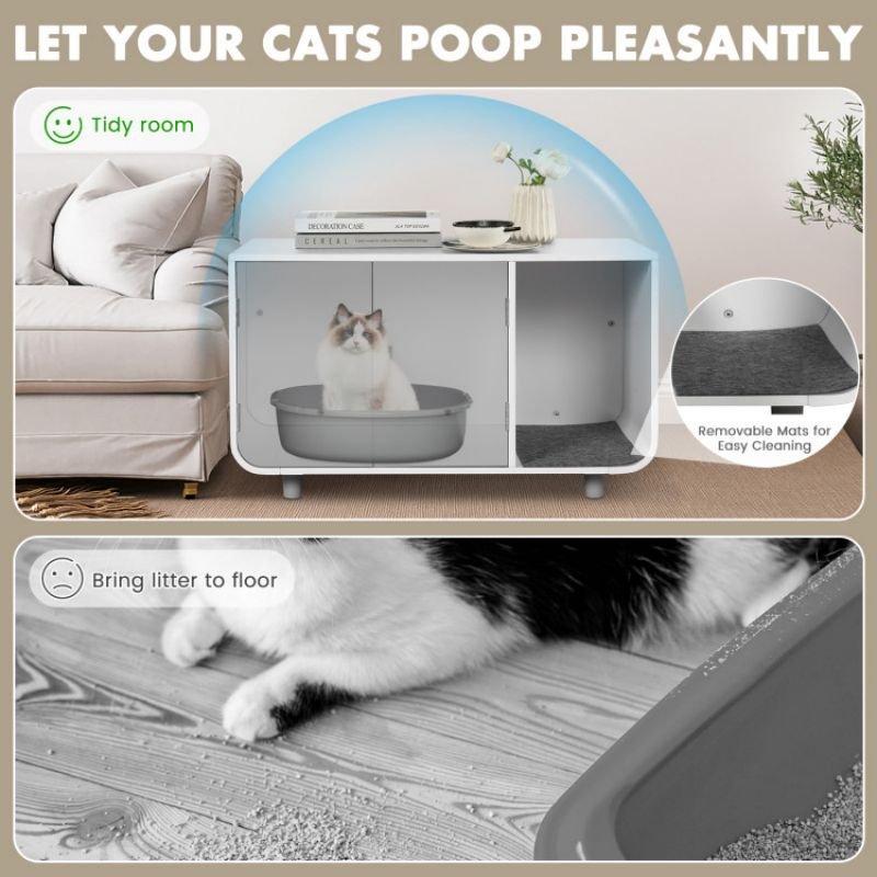1.Large Private Poop Spot: This hidden litter box furniture has a double door cabinet, which measures xxx to hold most litter boxes. Thus, it will offer a safe spot for your furry friends to poop freely! Moreover, it will reduce unpleasant smell while protecting your cat's privacy.