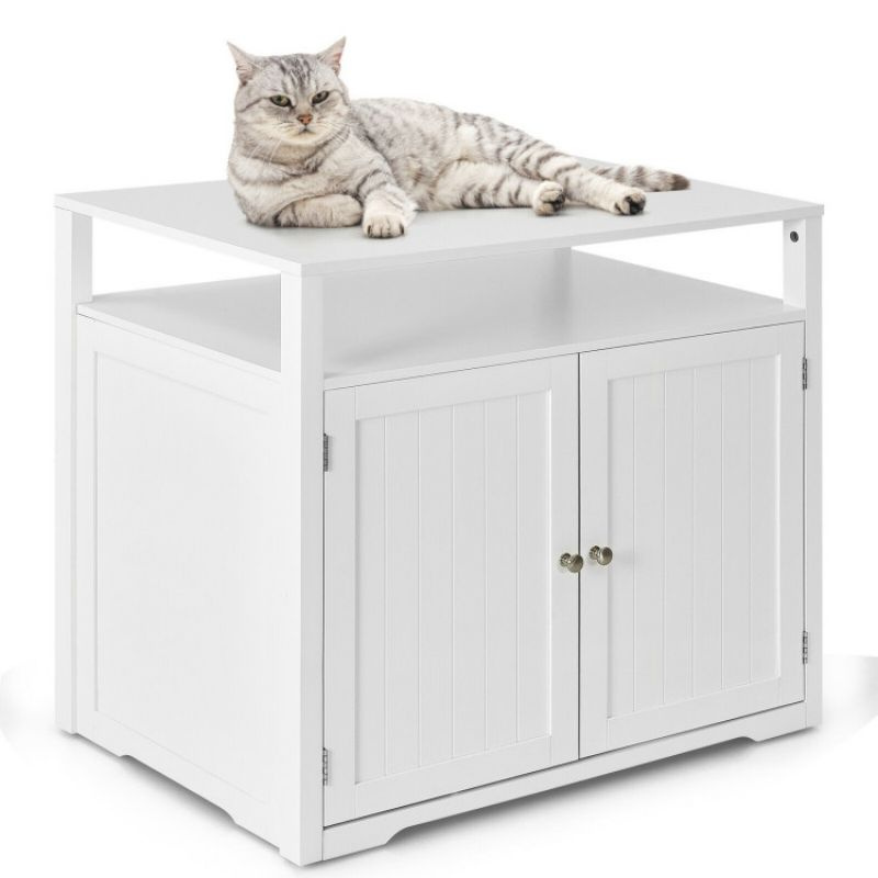 5.Practical and Large Space: Designed with a large top and an additional open shelf, this high-quality litter box cover provides spacious storage space for you. Hence, you can put different items easily, such as cat food, cat toys, and other pet supplies.
