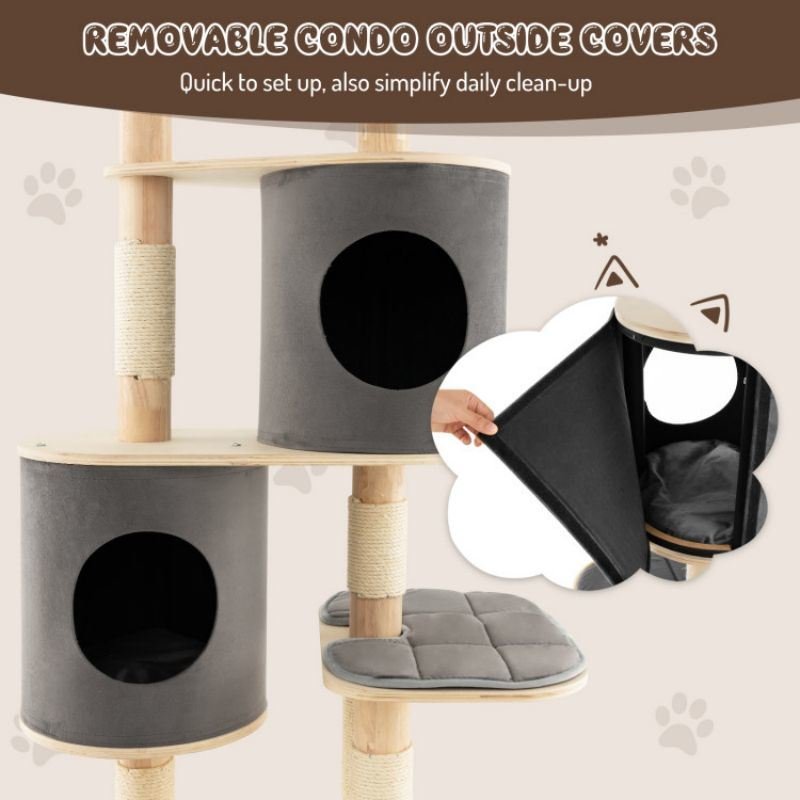 2.Cozy Condos and Detachable Covers: Overall, the 6-tier cat tower has 2 roomy condos, as personal shelters to make cats feel protected. Besides, both outside covers are detachable to open the interior space and simplify daily clean-up.