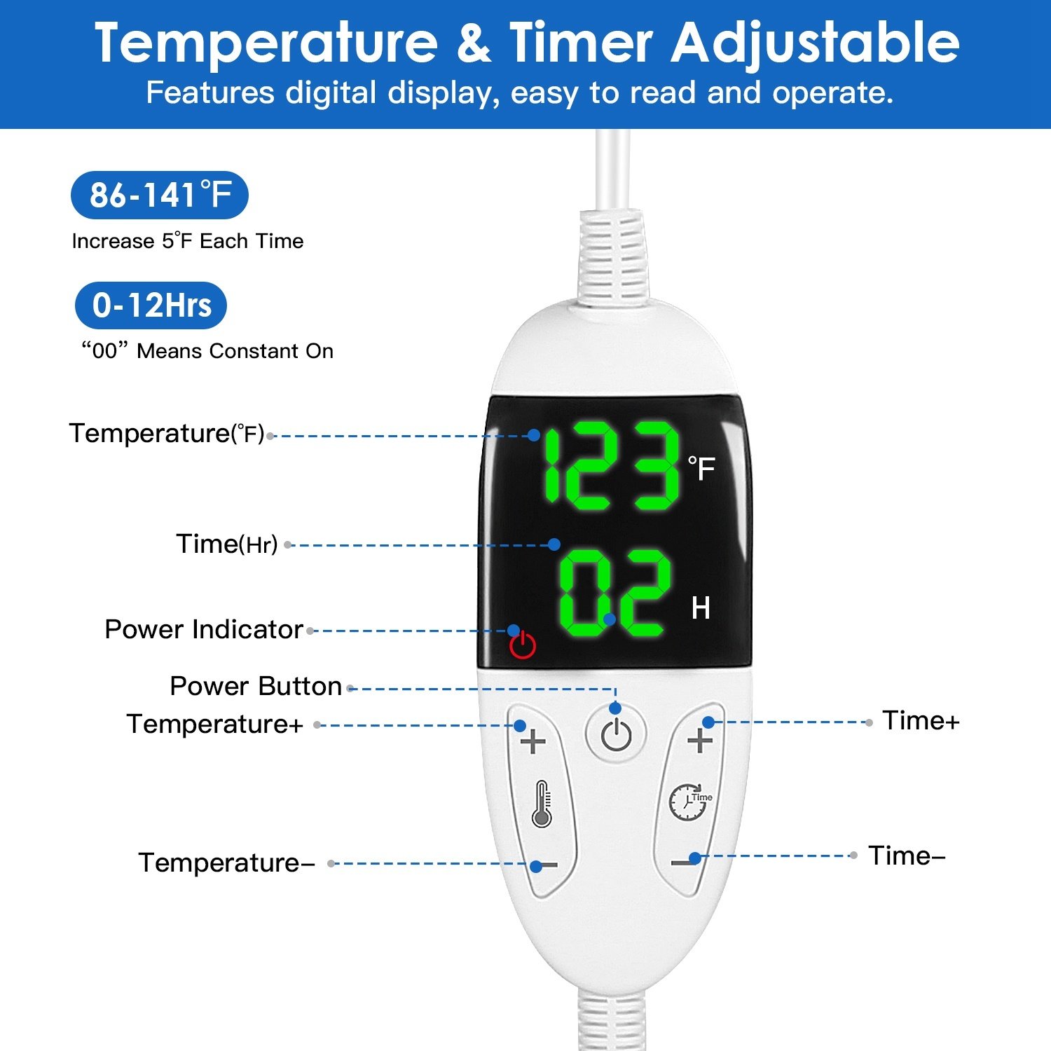 *86℉-141℉ Adjustable Temperature*:Our electric heating mat allows you to increase 5℉ each time from 86℉ to 141℉,which can find the most comfortable temperature for your beloved pets. Also feature digital display,easy to read and operate.