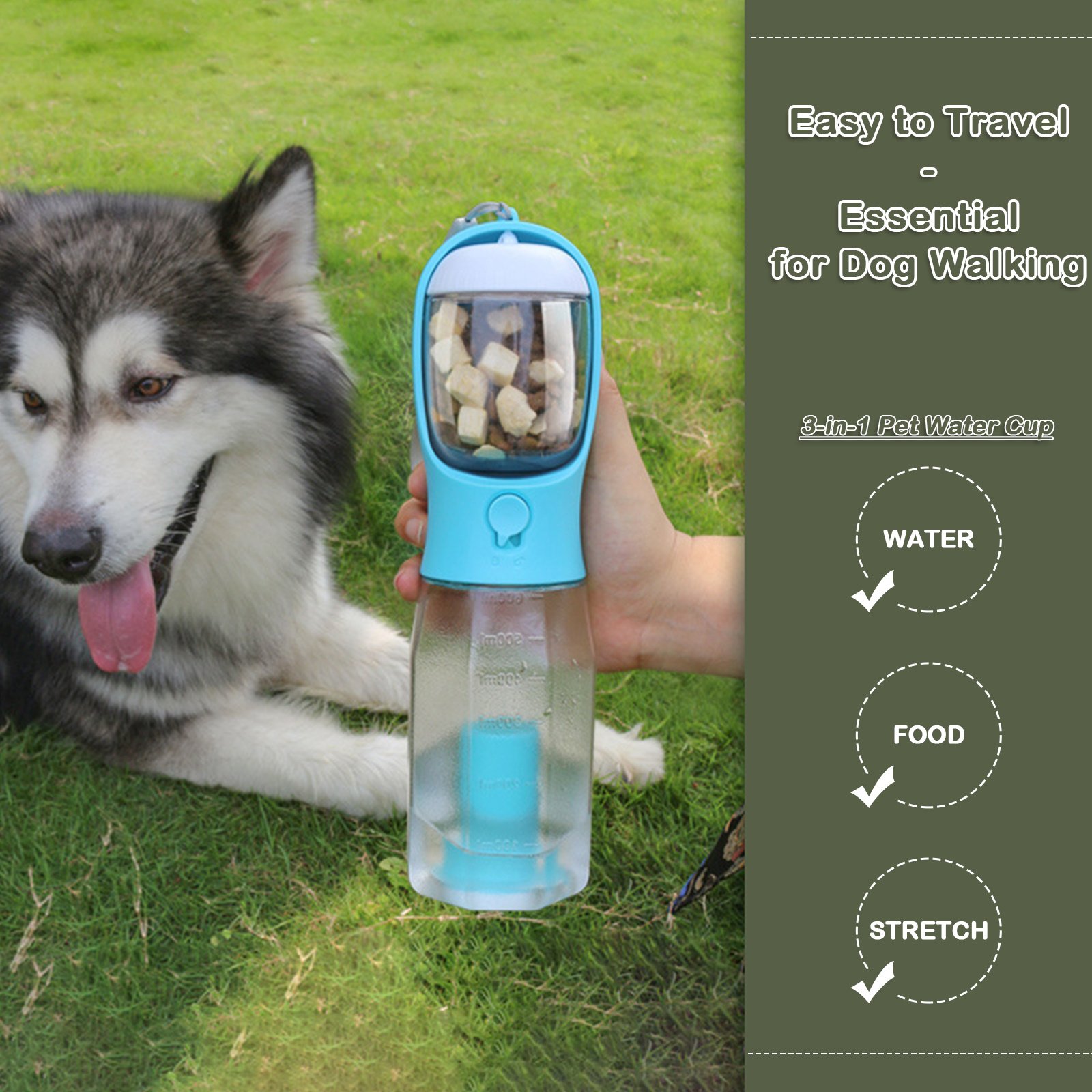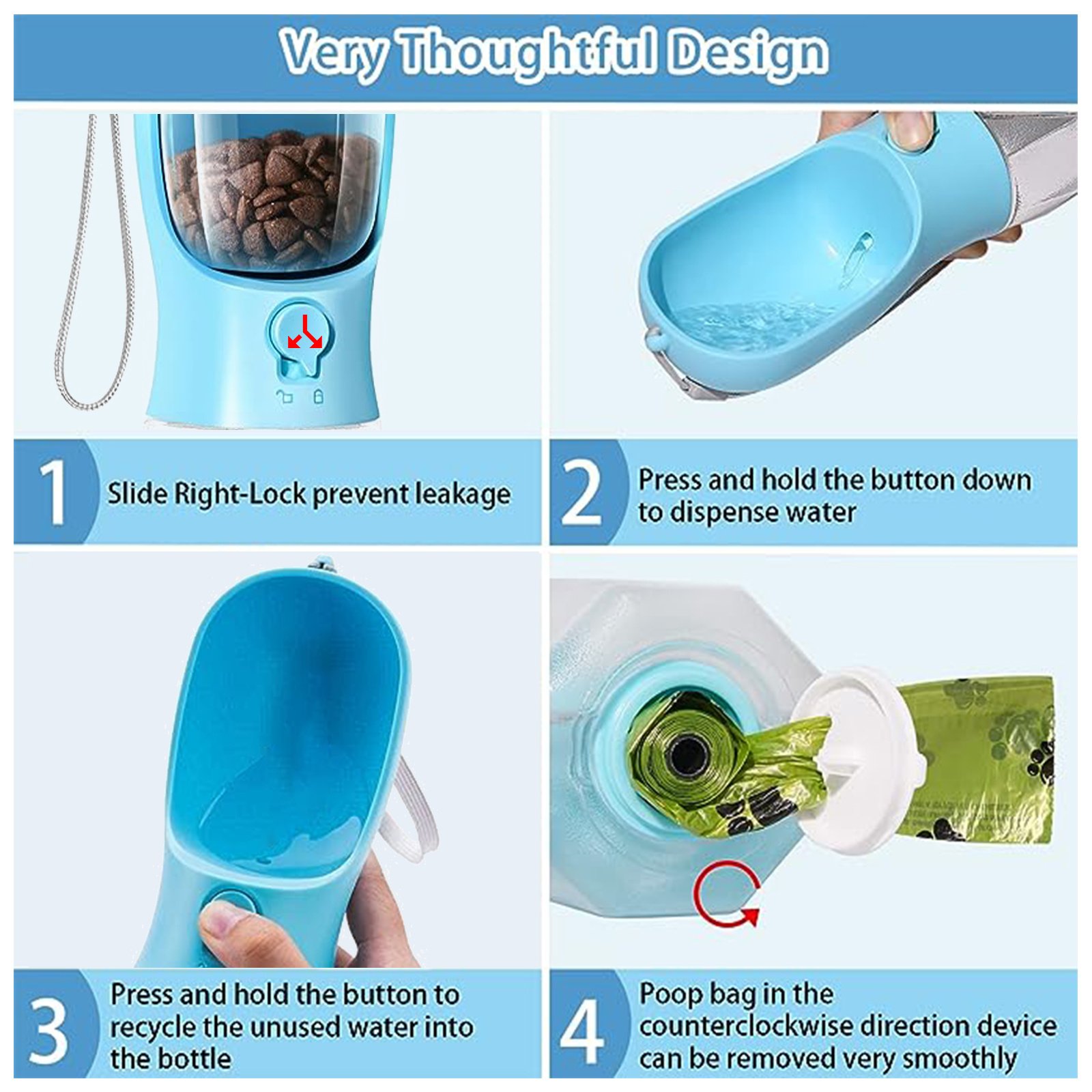 3 in1 Dog Outdoor Water Bottle,Portable Water Dispenser with Food Container,Poop Bag√ó3,Carbon Filter√ó2,Leak Proof Lock for Cat,Puppy and Other Pets