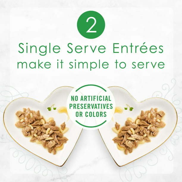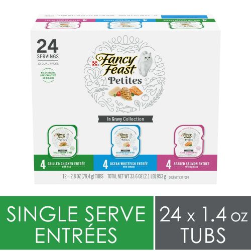 Purina Fancy Feast Petites Wet Cat Food Variety Pack, Turn feeding time into a gourmet experience for your cat with the sophisticated entrees in the Purina Fancy Feast Petites Gourmet Wet Cat Food Gravy Collection Variety Pack. Our tasty recipes let you tempt her discerning palate anytime with no mess and no leftovers. The premium cat food is packaged in single serving cat food trays for your convenience. Simply snap the divided tray in half, peel back the top and serve. Here at Purina, we craft our gourmet cat food with gravy with no artificial preservatives or colors to meet your ingredient preferences.
