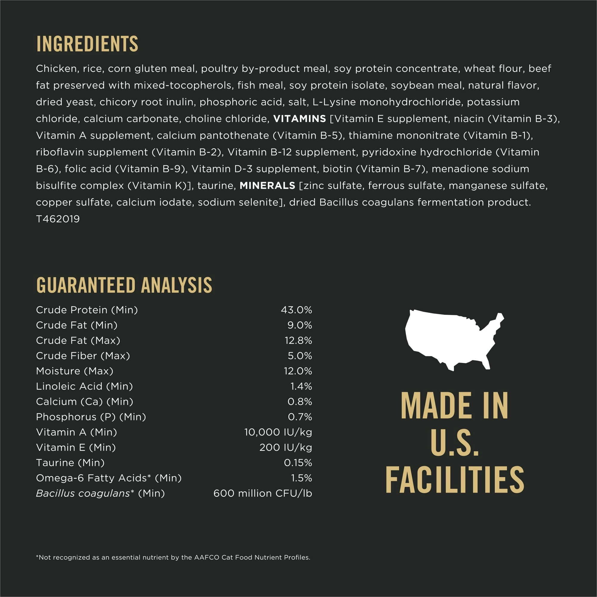 Purina Pro Plan Weight Management Dry Cat Food Chicken Rice, Deliver targeted nutrition to your cat's dish with Purina Pro Plan SPECIALIZED Weight Management Chicken Rice Formula adult dry cat food. Formulated with 43 percent protein, this weight control cat food helps your cat maintain lean muscle mass during weight loss and contains 20 percent less fat than Purina Pro Plan COMPLETE ESSENTIALS Adult Chicken Rice formula to help her maintain a healthy weight. We formulate this super-premium high-protein dry cat food with high-quality sources of protein, including real chicken as the first ingredient, and carefully select every high-quality ingredient for a specific purpose.